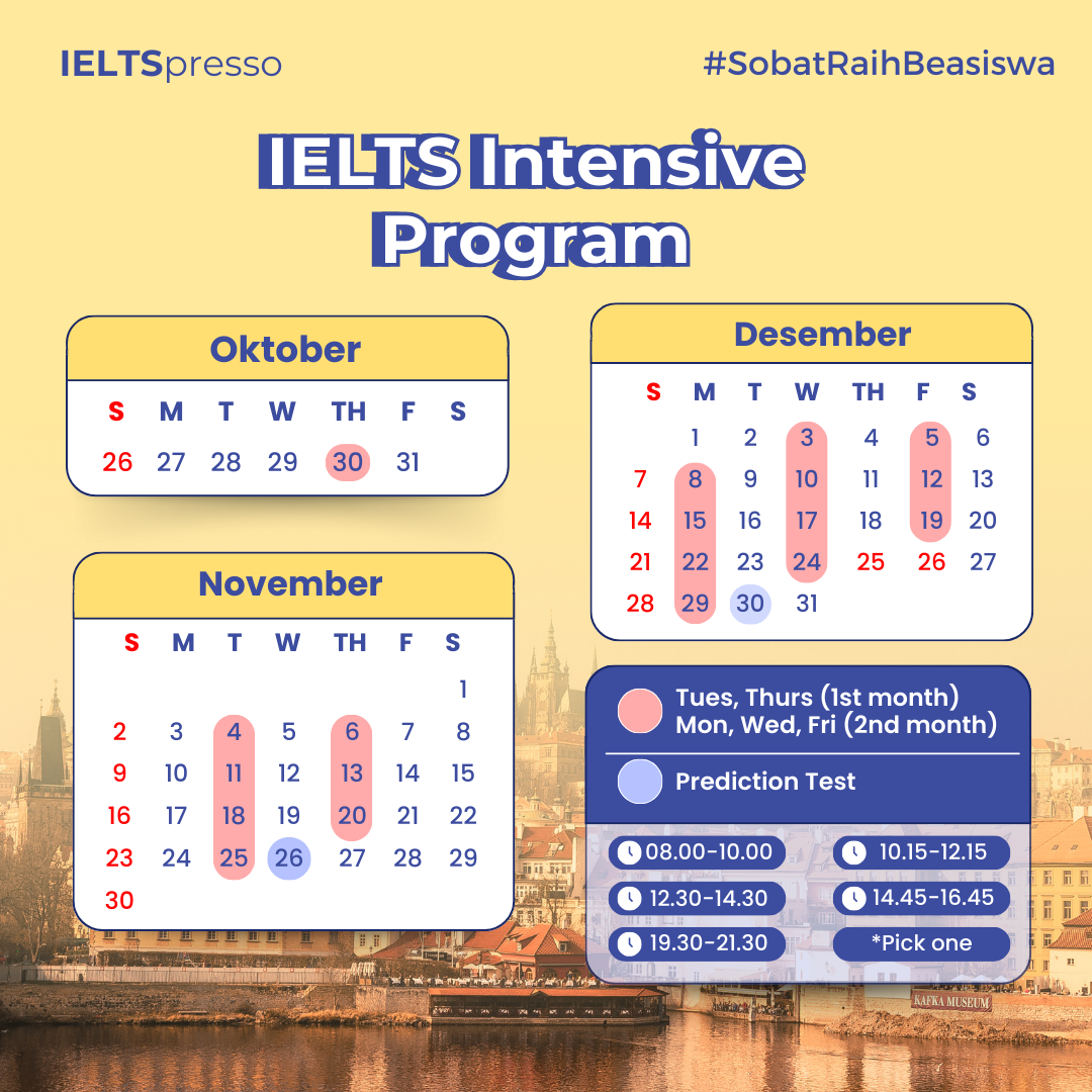 Padatnya jadwal kuliah atau kerja kini bukan lagi hambatan. Dengan IELTS Intensive Program ini kamu tetap bisa belajar IELTS meski di tengah kesibukan. Kelas berlangsung 2-3 kali per pekan, paling pas buat kamu yang punya rencana tes dalam 2-4 bulan ke depan. Bisa dapat kelas pengayaan juga hingga 10 jam kalau kamu akan tes IELTS. Program favorit kedua yang paling banyak menghasilkan alumni sukses!