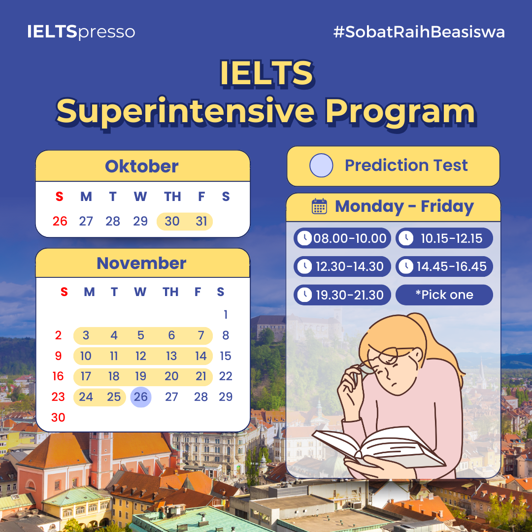 Program bimbingan persiapan IELTS yang paling cocok buat Sobat yang punya target tes dalam waktu dekat atau 1-2 bulan ke depan. Semua hal-hal yang perlu kamu tau tentang soal IELTS dan bagaimana strategi terbaik menghadapinya ada di sini, Sob. Semua materi dilahap dalam 1 bulan. Bonus kelas pengayaan hingga 10 jam bila kamu akan tes IELTS. Makanya ga salah kalau program ini jadi salah satu program terfavorit yang paling banyak menghasilkan alumni sukses dalam tes IELTS!