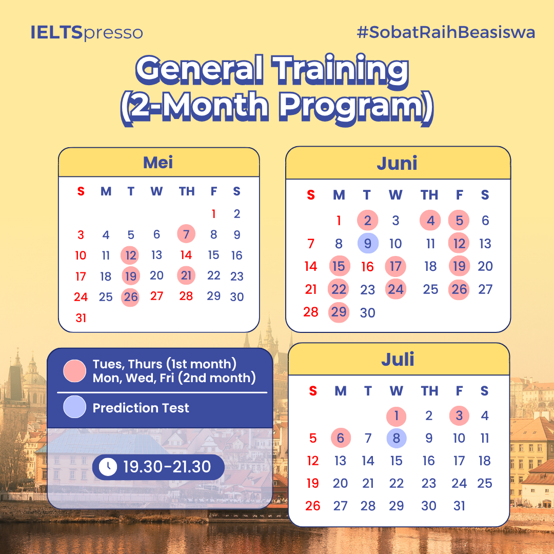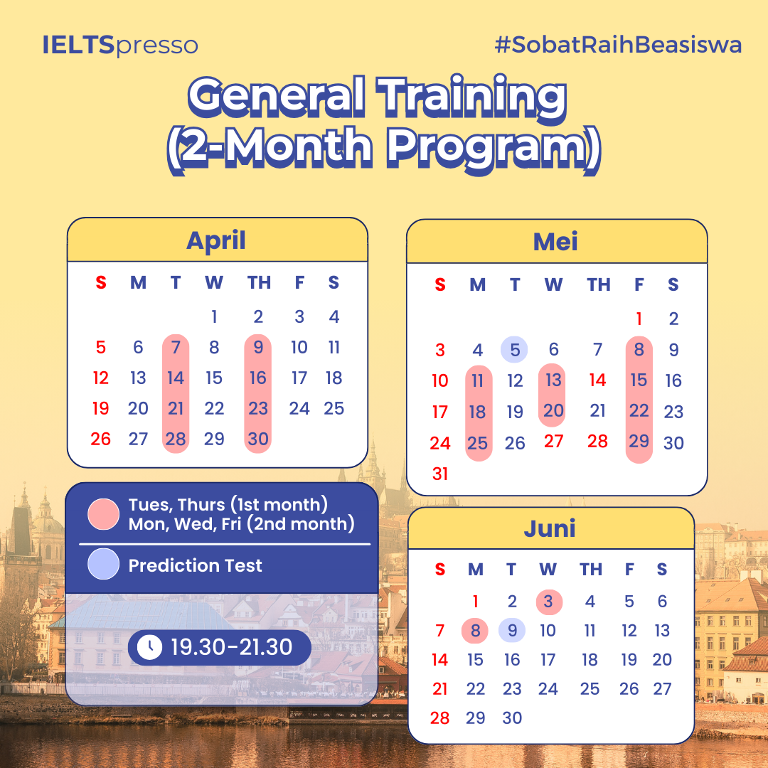 Padatnya jadwal kuliah atau kerja kini bukan lagi hambatan. Dengan IELTS General Training Exclusive Class (2-month) ini kamu tetap bisa belajar IELTS meski di tengah kesibukan. Kelas berlangsung 2-3 kali per pekan, paling pas buat kamu yang punya rencana tes dalam 2-4 bulan ke depan.Â