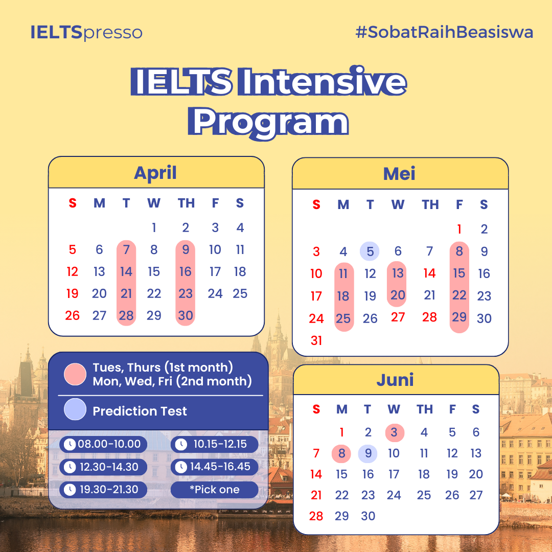 Padatnya jadwal kuliah atau kerja kini bukan lagi hambatan. Dengan IELTS Intensive Program ini kamu tetap bisa belajar IELTS meski di tengah kesibukan. Kelas berlangsung 2-3 kali per pekan, paling pas buat kamu yang punya rencana tes dalam 2-4 bulan ke depan. Bisa dapat kelas pengayaan juga hingga 10 jam kalau kamu akan tes IELTS. Program favorit kedua yang paling banyak menghasilkan alumni sukses!