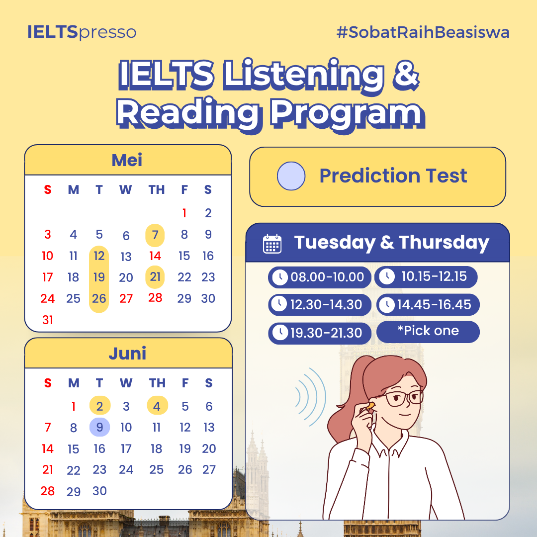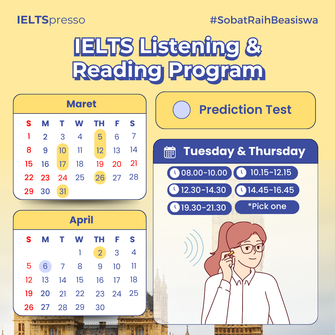 Program partial buat Sobat yang mau belajar Listening & Reading dalam IELTS terlebih dahulu. Paling pas buat kamu yang ingin mulai belajar IELTS dari dua komponen termudah.