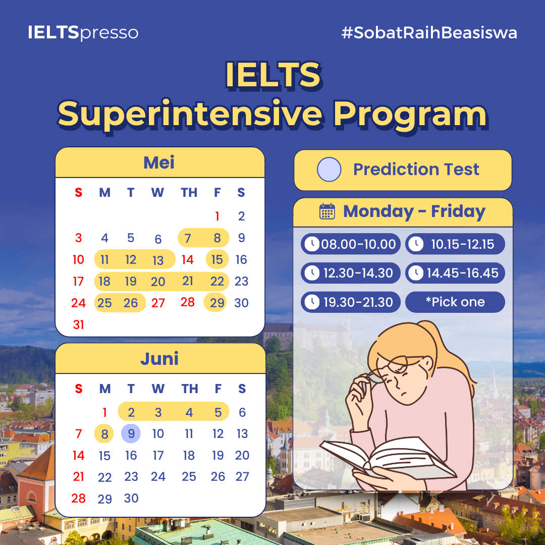 Program bimbingan persiapan IELTS yang paling cocok buat Sobat yang punya target tes dalam waktu dekat atau 1-2 bulan ke depan. Semua hal-hal yang perlu kamu tau tentang soal IELTS dan bagaimana strategi terbaik menghadapinya ada di sini, Sob. Semua materi dilahap dalam 1 bulan. Bonus kelas pengayaan hingga 10 jam bila kamu akan tes IELTS. Makanya ga salah kalau program ini jadi salah satu program terfavorit yang paling banyak menghasilkan alumni sukses dalam tes IELTS!