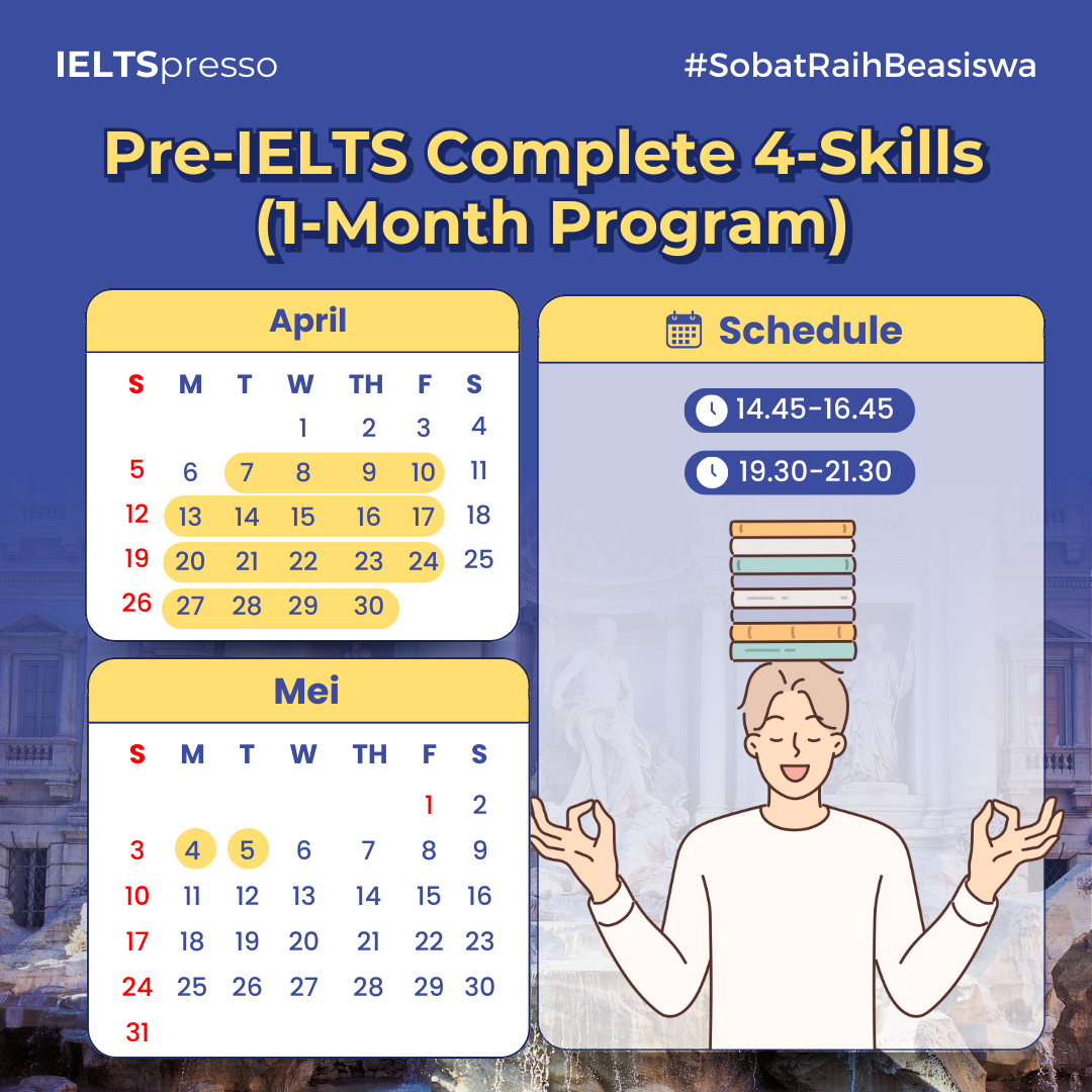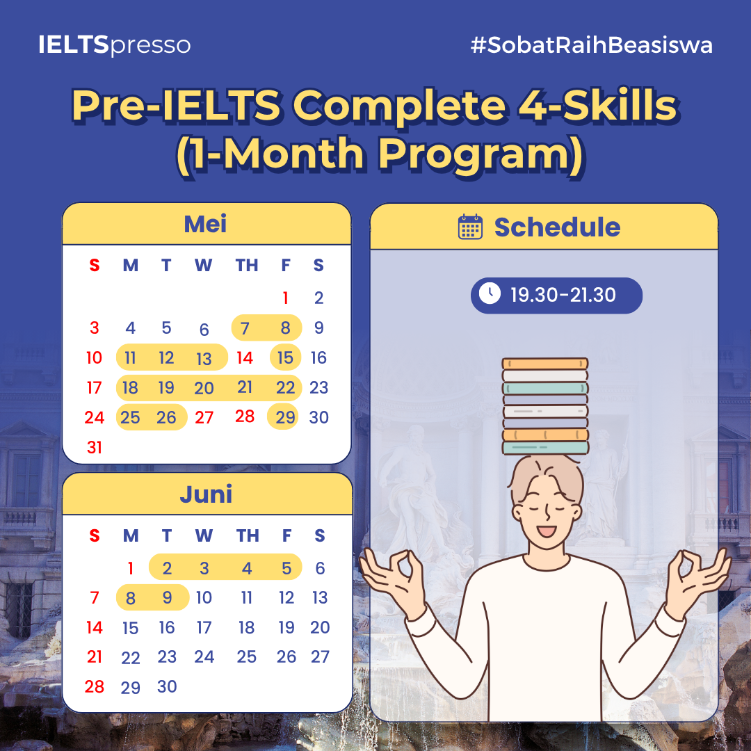 Baru mau belajar IELTS tapi ngerasa basic English kamu masih pas-pasan? Worry no more! Dengan program Pre-IELTS, kamu bisa mengenal dasar-dasar yang kamu butuhkan sebelum mendalami IELTS lebih jauh. Selama sebulan penuh, kamu bakal belajar basic IELTS mulai dari Listening, Reading, Writing, hingga Speaking.Â