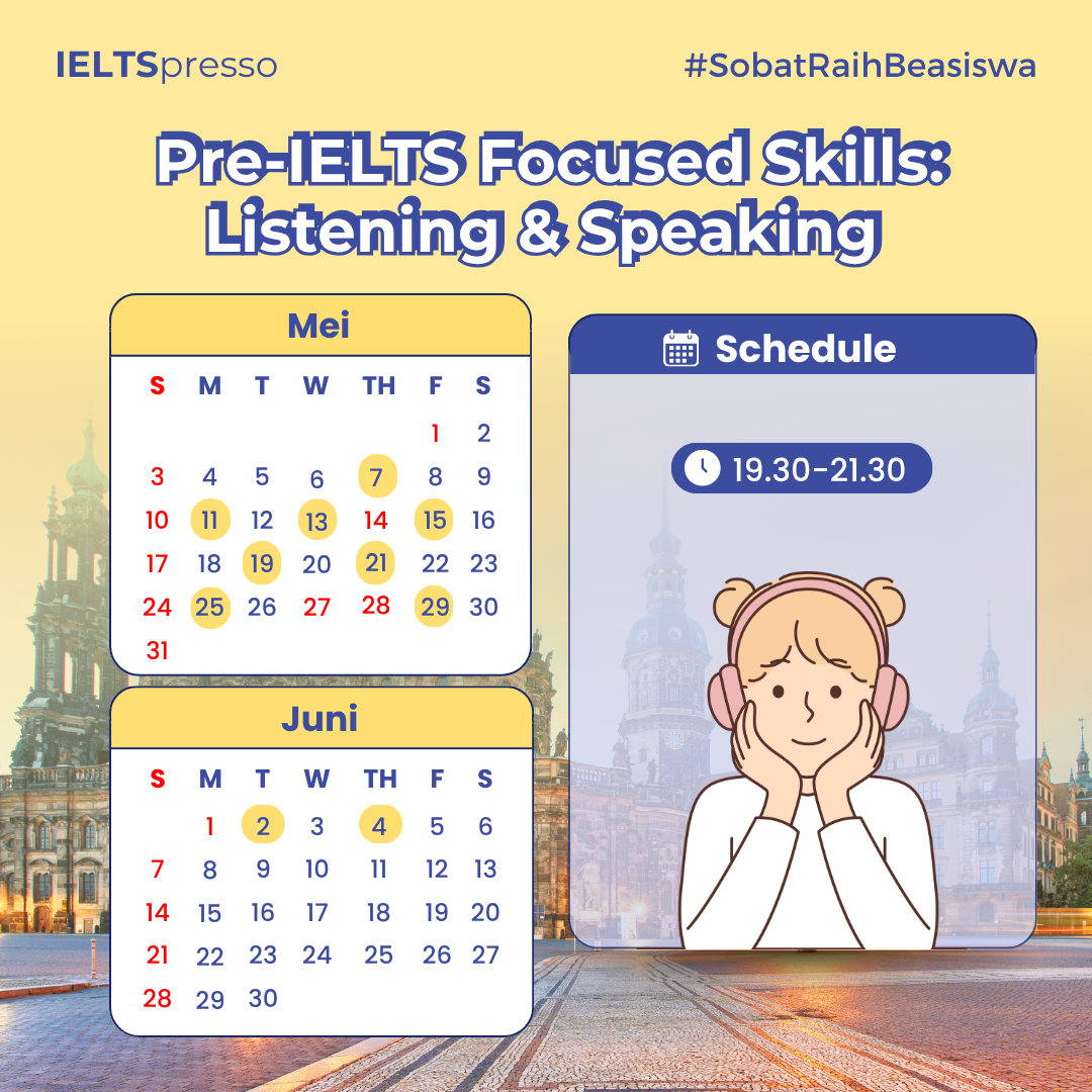 Pengen belajar basic IELTS tapi belum siap belajar semua skill secara penuh? Program ini paling pas buat kamu! Di sini kamu bakal belajar skill Listening dan Speaking selama sebulan penuh. Ga perlu khawatir, kurikulum Pre-IELTS ini dirancang khusus buat pemula yang baru mau belajar IELTS.Â