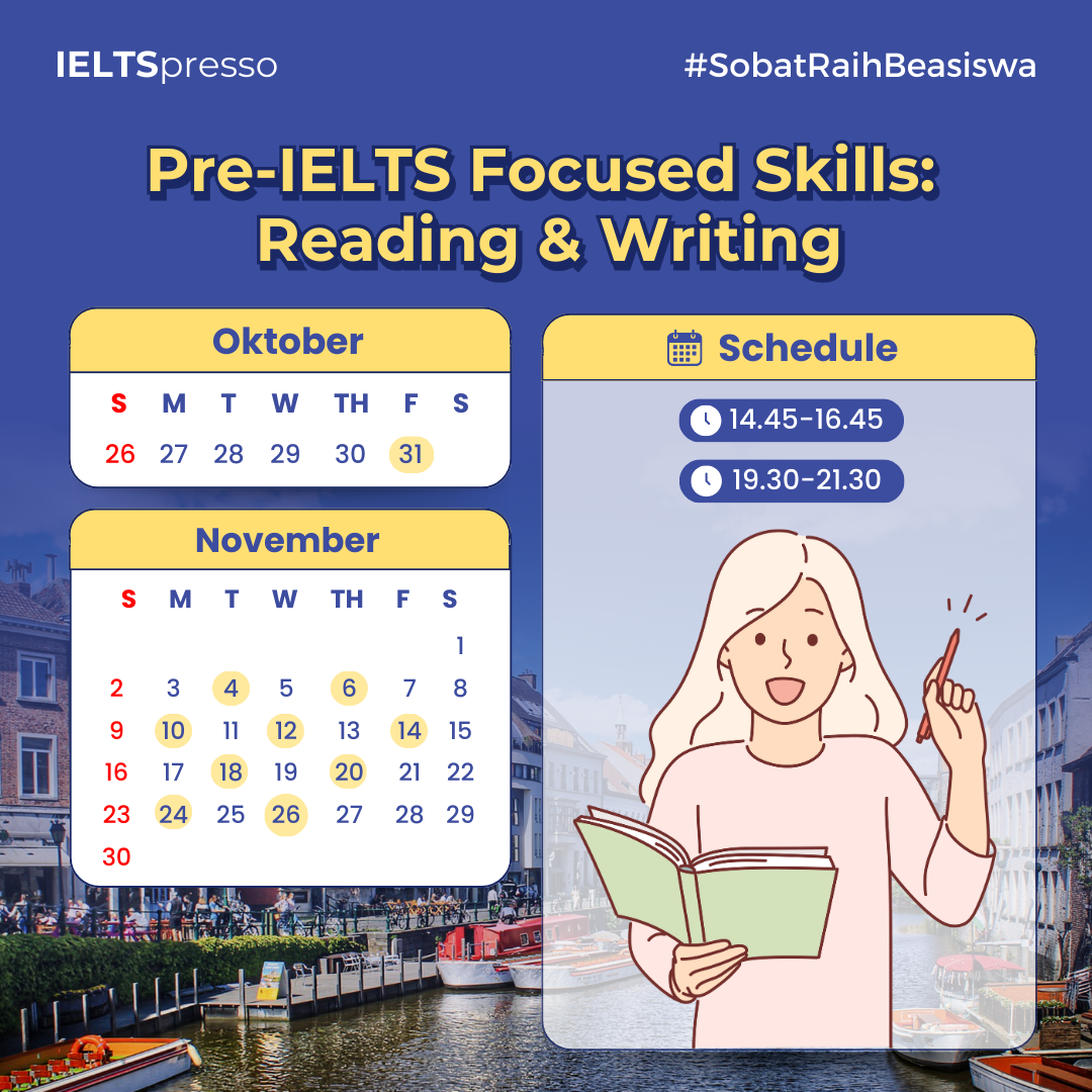 Pengen belajar basic IELTS tapi belum siap belajar semua skill secara penuh? Program ini paling pas buat kamu! Di sini kamu bakal belajar skill Reading dan Writing selama sebulan penuh. Ga perlu khawatir, kurikulum Pre-IELTS ini dirancang khusus buat pemula yang baru mau belajar IELTS.Â